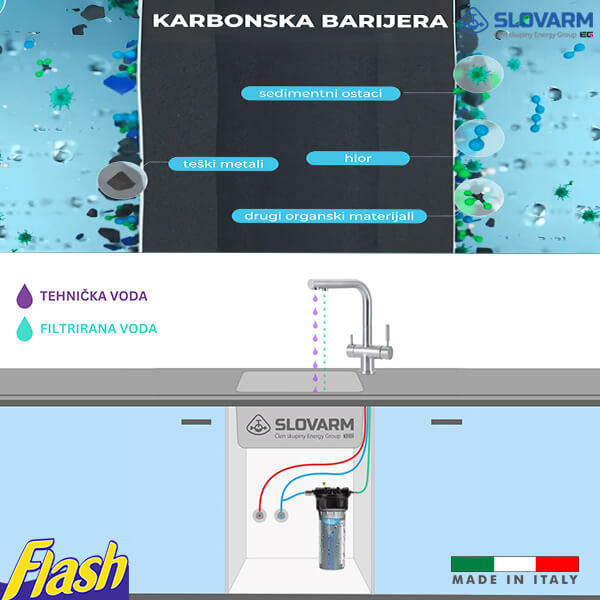 Ova slavina se povezuje ne samo na standardni dovod vode, već istovremeno i na sistem za filtraciju, omogućavajući jednostavno korišćenje i filtrirane i nefiltrirane vode iz jednog izvora.